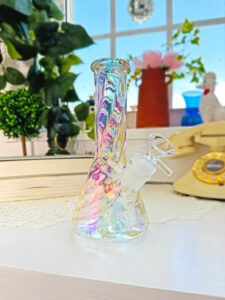 With the twisted iridescent detailing on the neck, this bong is begging for a spot on your shelf when not in use! A super sturdy beaker base keeps her stable if you’re accident prone like us 💅 and she even has an ice catcher for super smooth hits!