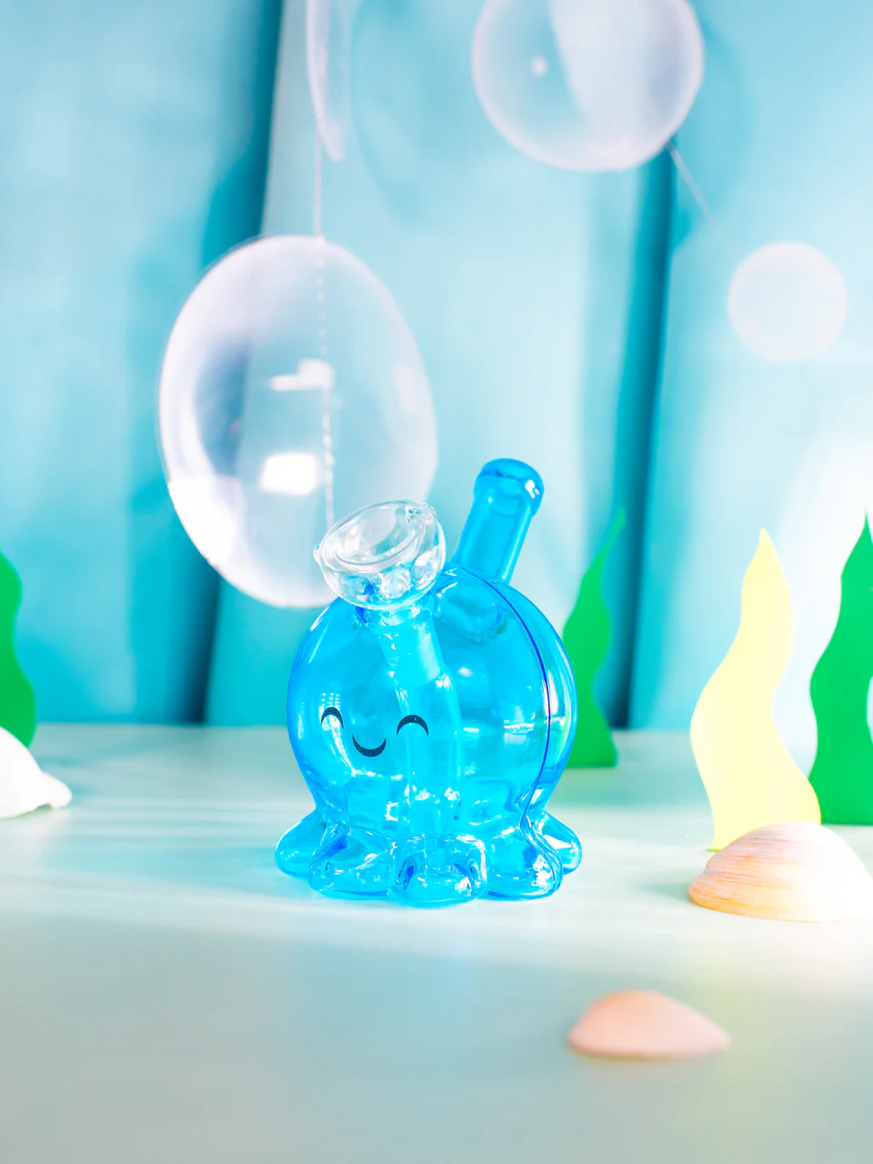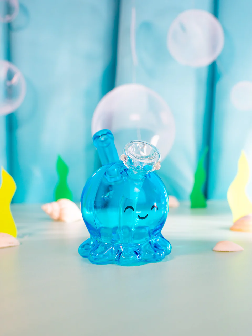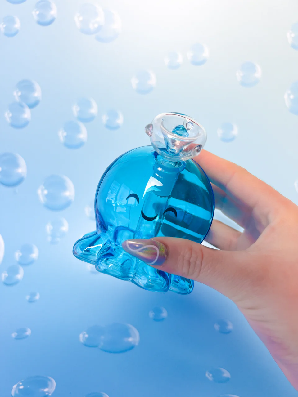 This cutie is one of our best sellers and for good reason! This bubbler may be tiny but will definitely pack an 8-legged punch! She has a convenient straw mouth piece and the baby tentacles provide a nice sturdy base and better grip during your sesh! This octo cutie will also look adorable sitting on a shelf (or by a fish tank!) when not in use! We love a statement piece, especially if it has a 🙂 on it